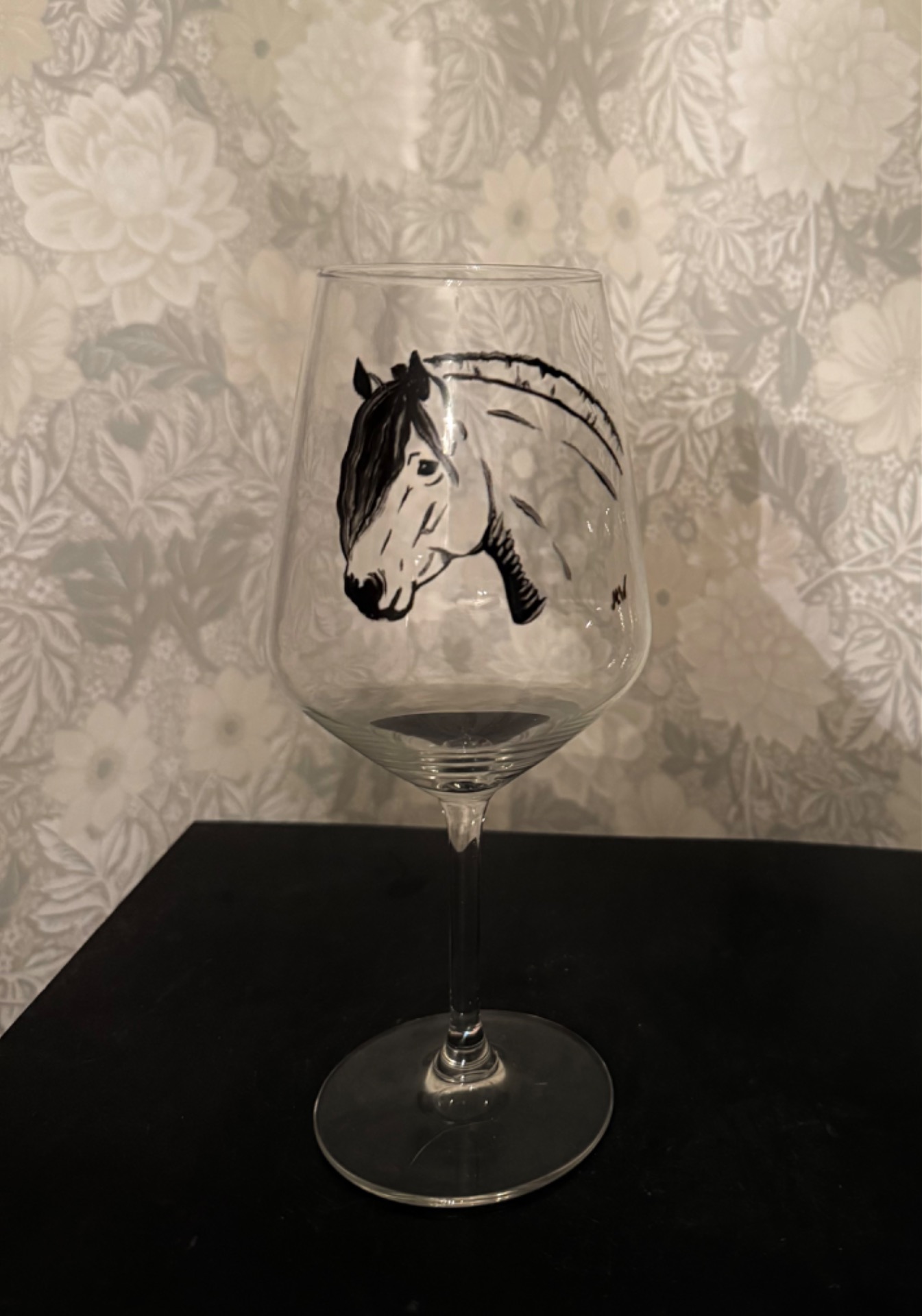 Graverade glasmuggar/koppar med underlägg av kork, fjordhästmotiv.